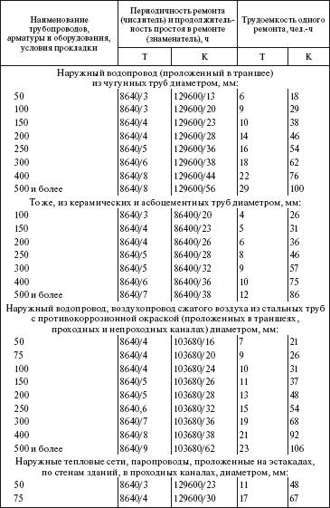 13.4.1. Нормативы периодичности, продолжительности и трудоемкости ремонта трубопроводов, трубопроводной арматуры и санитарно-технического оборудования приведены в табл. 13.1 (на 100 погонных метров длины трубопроводов).